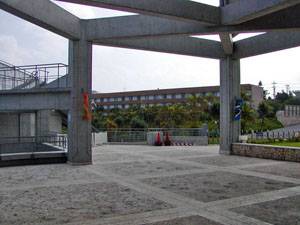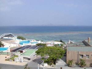 美ら海水族館入り口から見たロイヤルビューホテル。 |