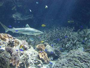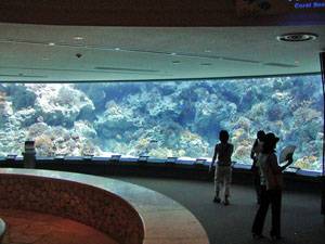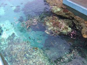 オープンと同時に入館。(9:30) 最初は珊瑚の海。 これが入館前に上から見えた水槽。 |
