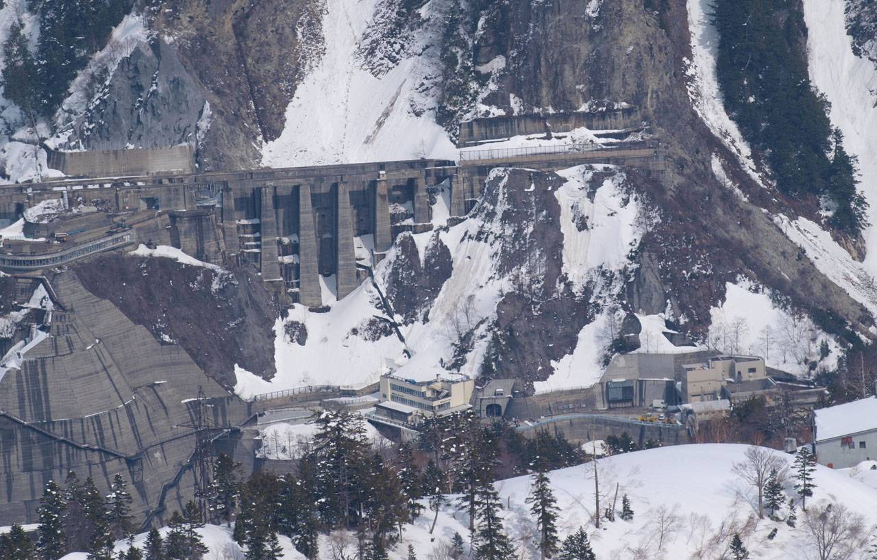 眼下に氷の張った黒部湖が見えるけど、黒部ダムは微妙に見えない。
