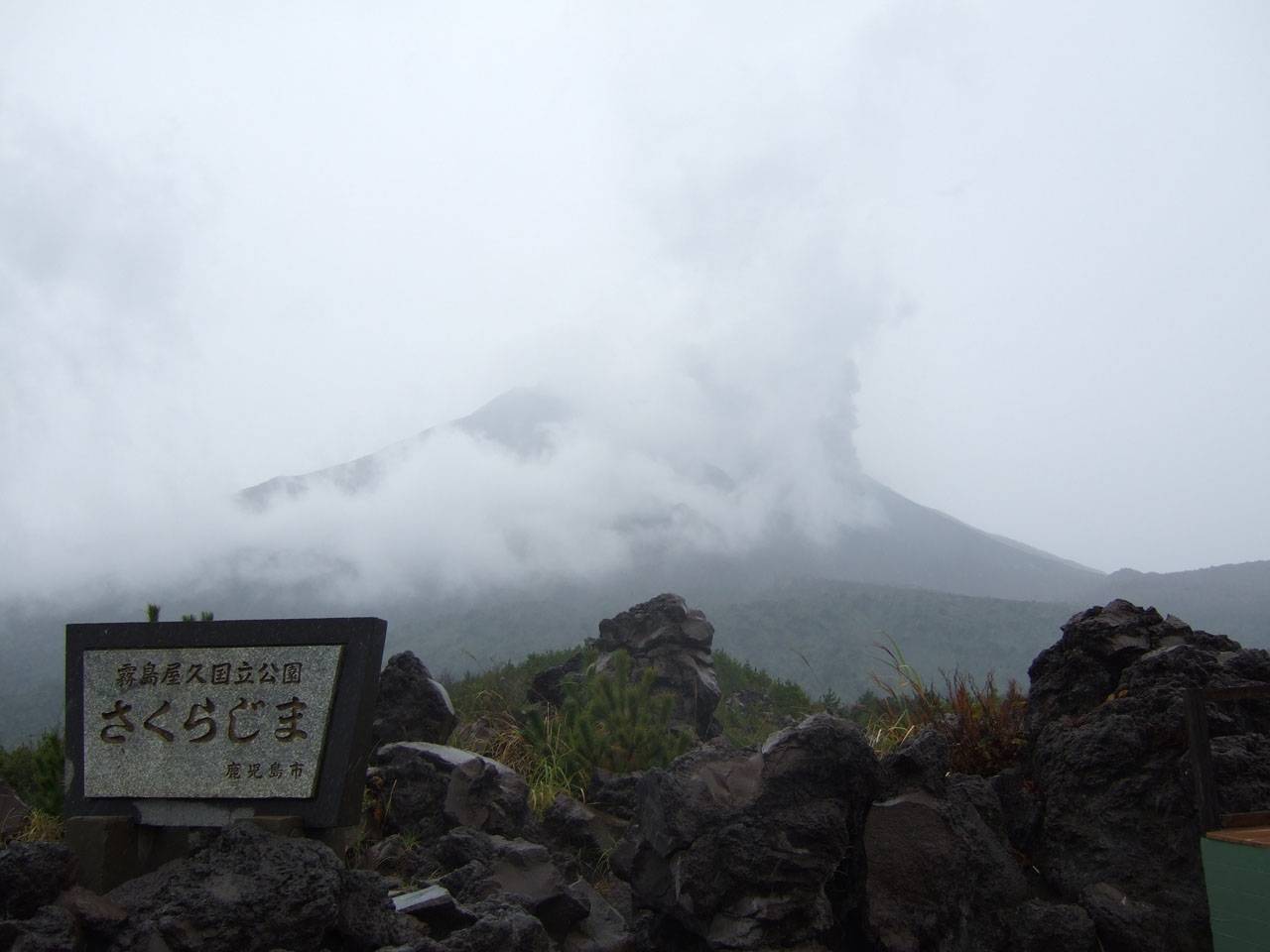 まだ雨が降っていて良く見えないけど、あれは雲じゃなくて噴煙?