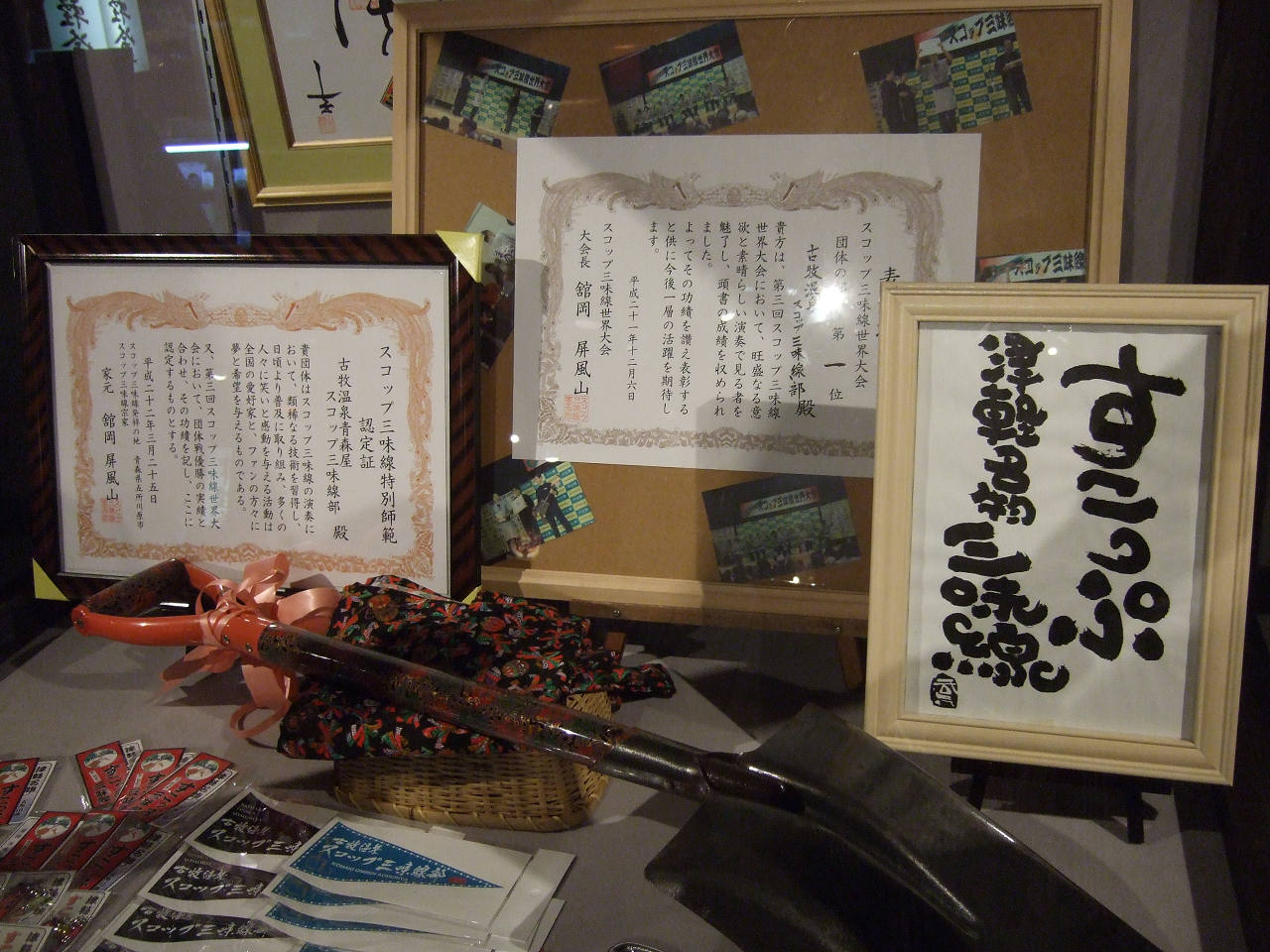ステージの近くにはスコップ三味線世界大会優勝の賞状とスコップトロフィー、特別師範認定証が飾ってある。