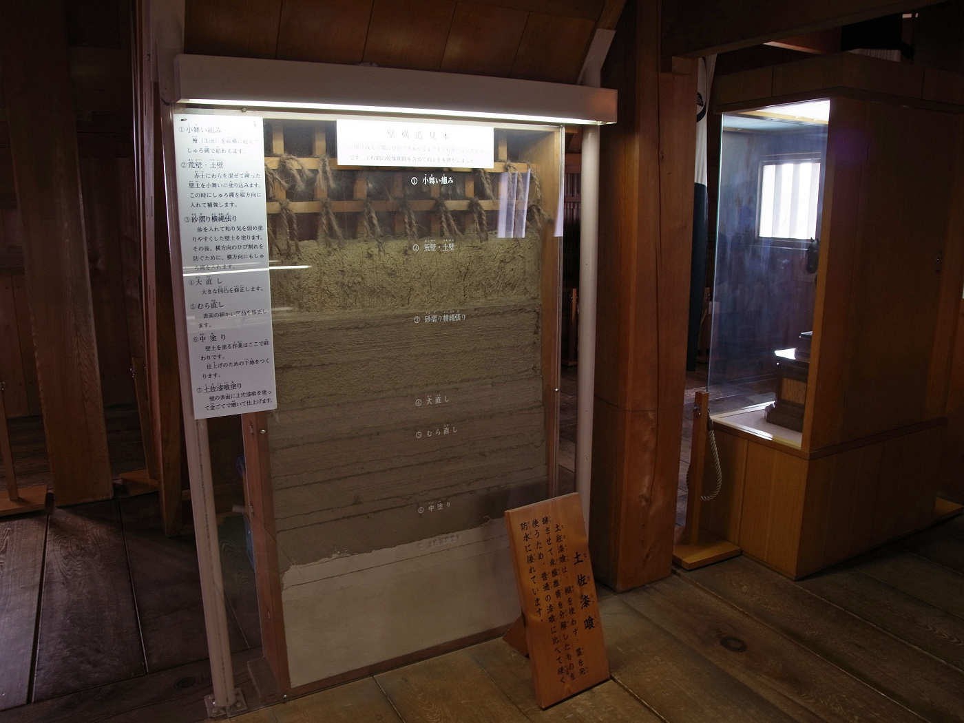 1階まで降りると、階段の裏側に土佐漆喰の構造説明が有った。