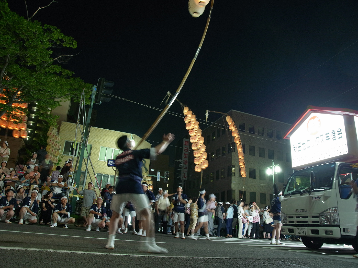 秋田いすゞ竿燈会は近すぎて写真のフレームに入り切らない…