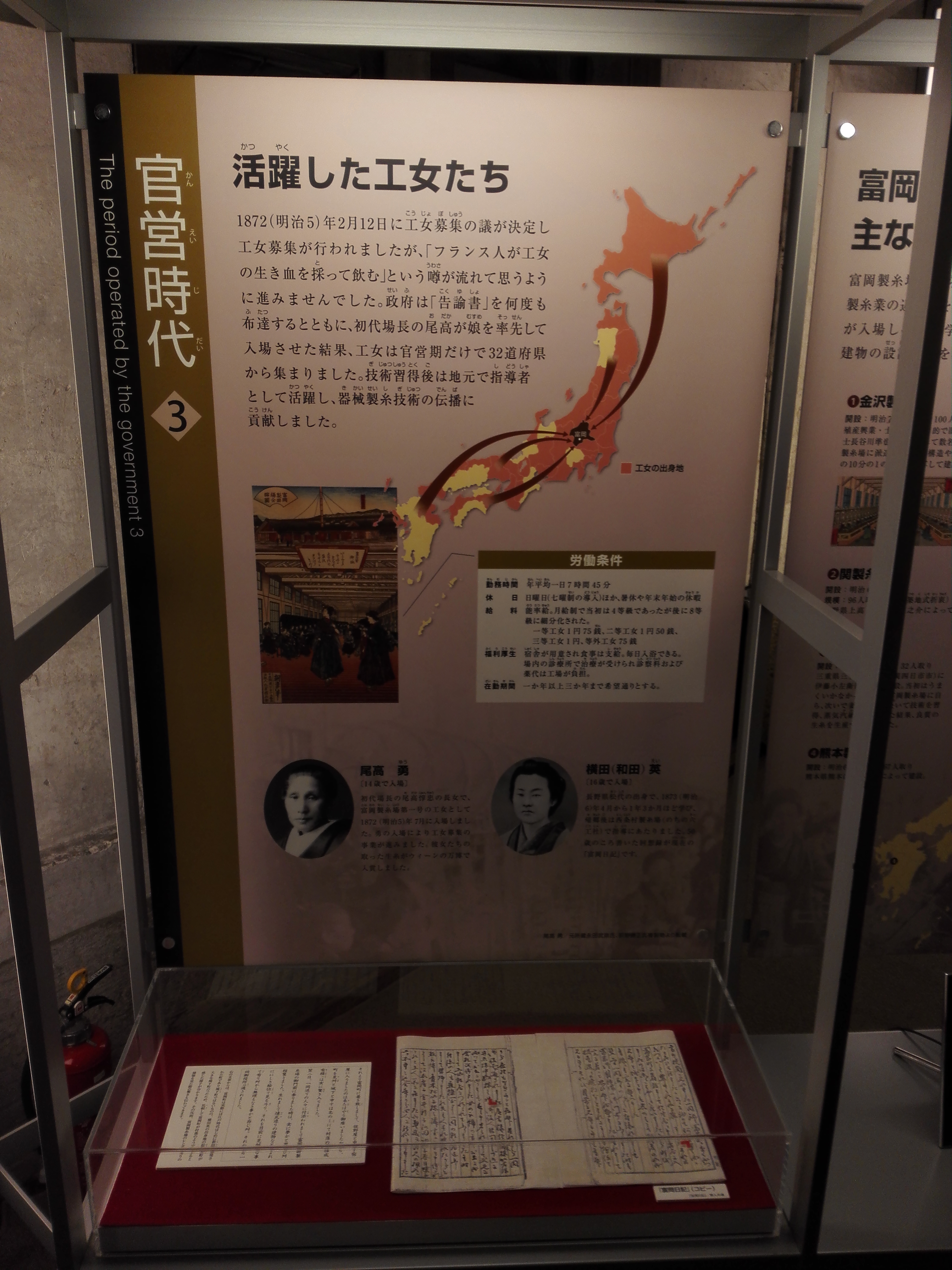 調べてみたら、富岡製糸場ができた頃(明治5年)はフランス式の労働条件が取り入れられた官営だったから、とっても待遇が良かったらしい。