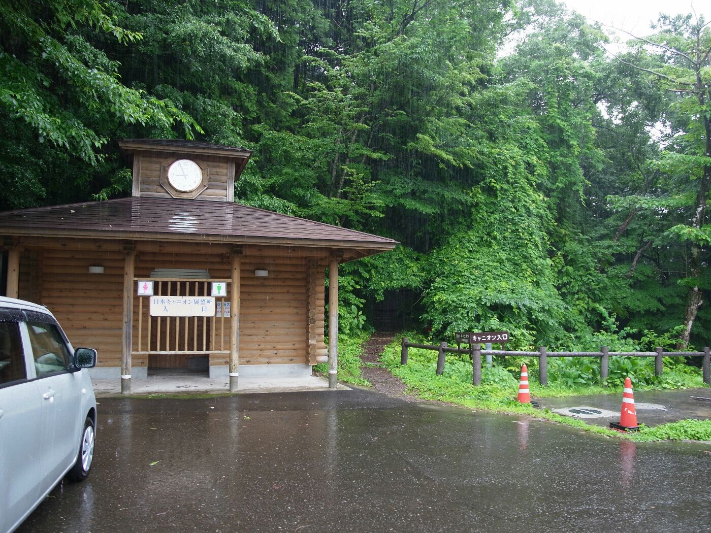 五能線沿いに順調に走り、十二湖駅を過ぎたところで十二湖案内板に従って左折、県道280号を少し登って日本キャニオン入口に到着。
