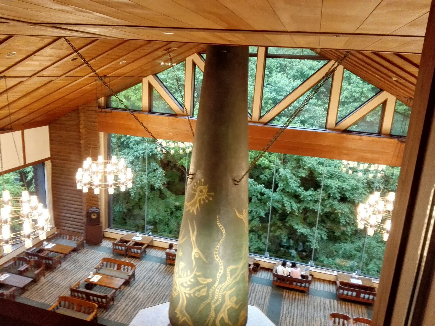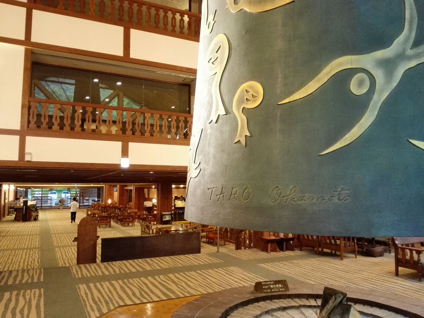 風呂へ行く途中に、吹抜け上部から岡本太郎の「森の神話」を眺める。