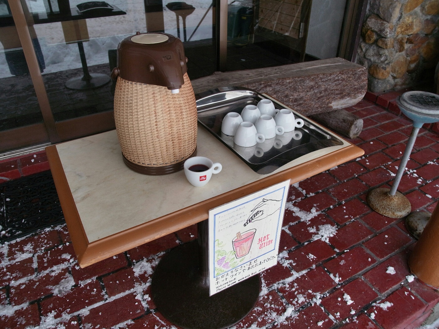 玄関にウェルカムドリンクのホットワインがセットされている。