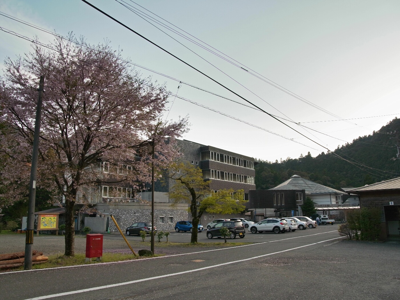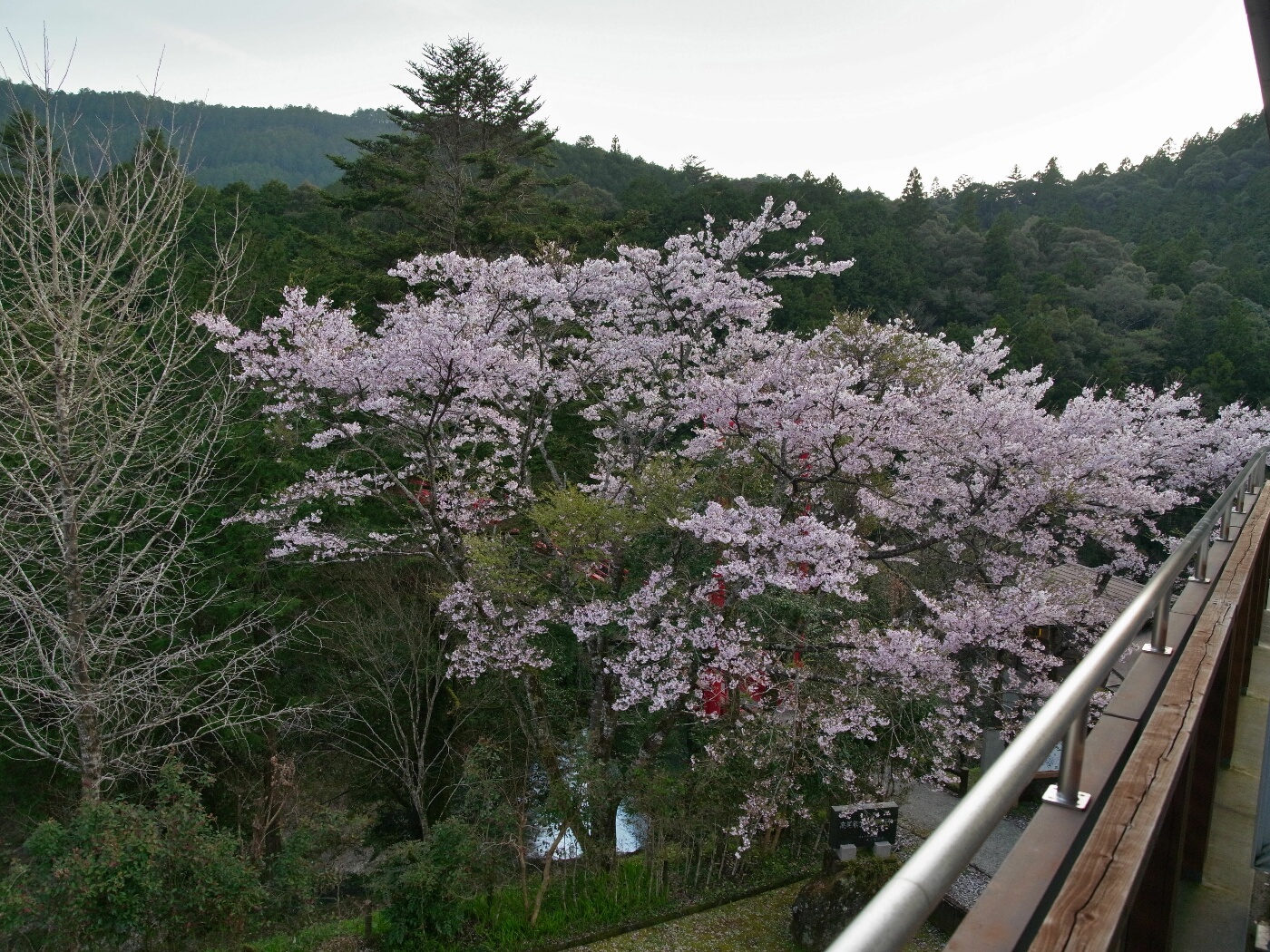 ベランダからは、散り始めの桜と四万十川支流日野地川が見える。