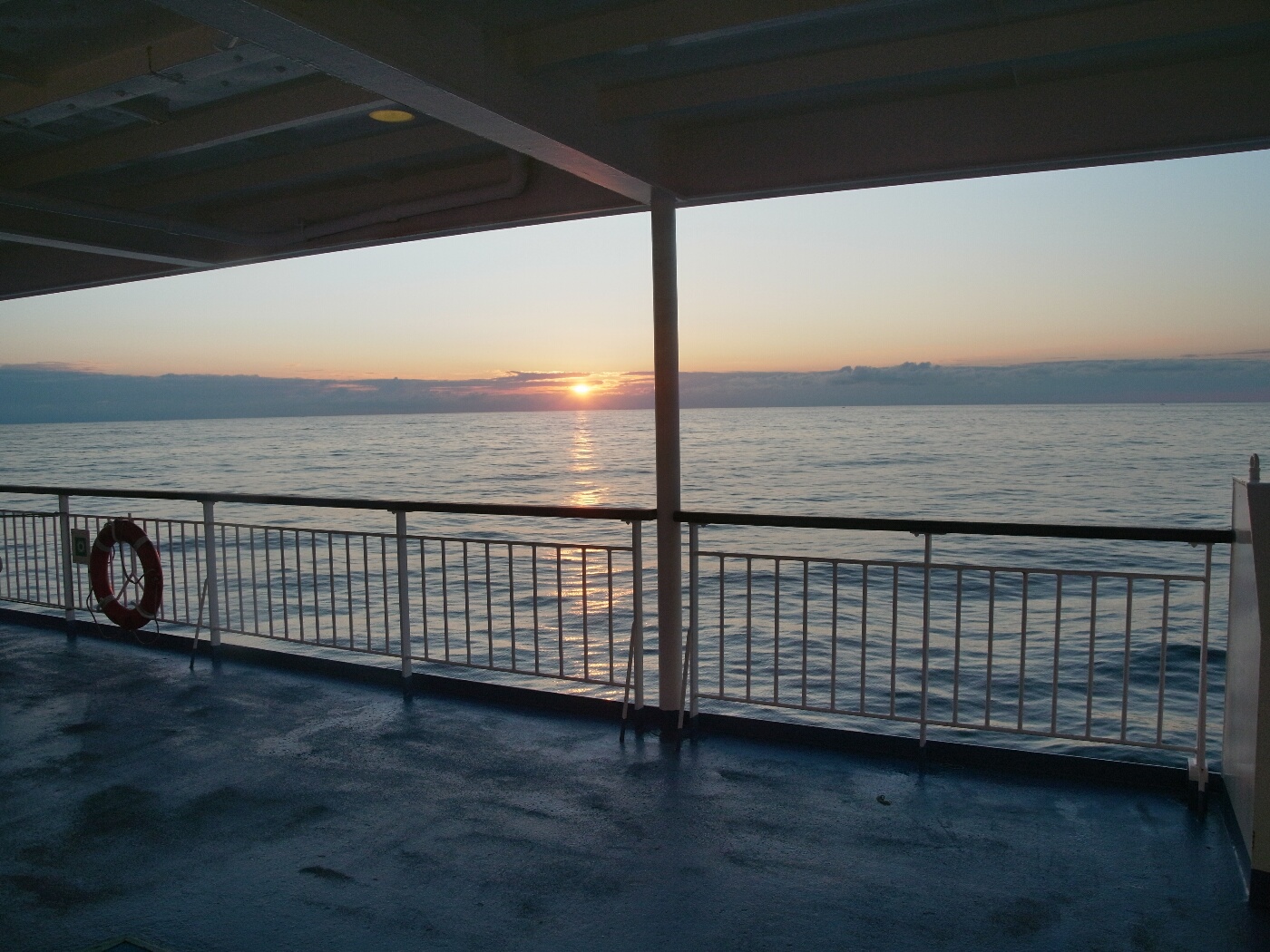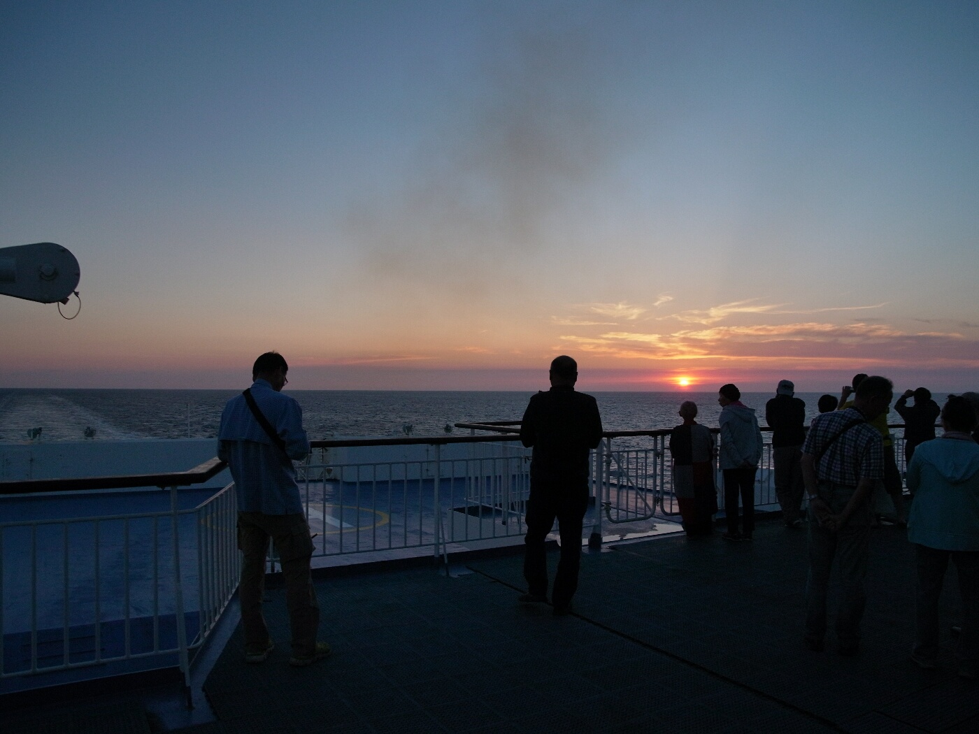 夕日がいよいよ傾いてきて、後部デッキに人が集まりはじめた。
