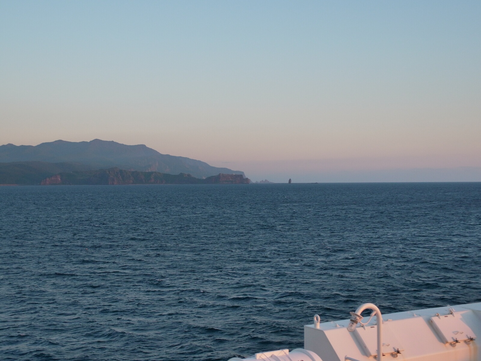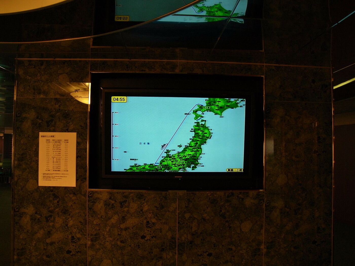 10時頃には姉妹船とのすれ違いが見られるはずで、両方ともかなりのスピードで走っているから(30ノット55km/h)迫力ある景観を期待していたんだけど「本日は僚船との距離が離れているためすれ違いをご覧いただく事はできません。」ってアナウンスがあってガッカリ…