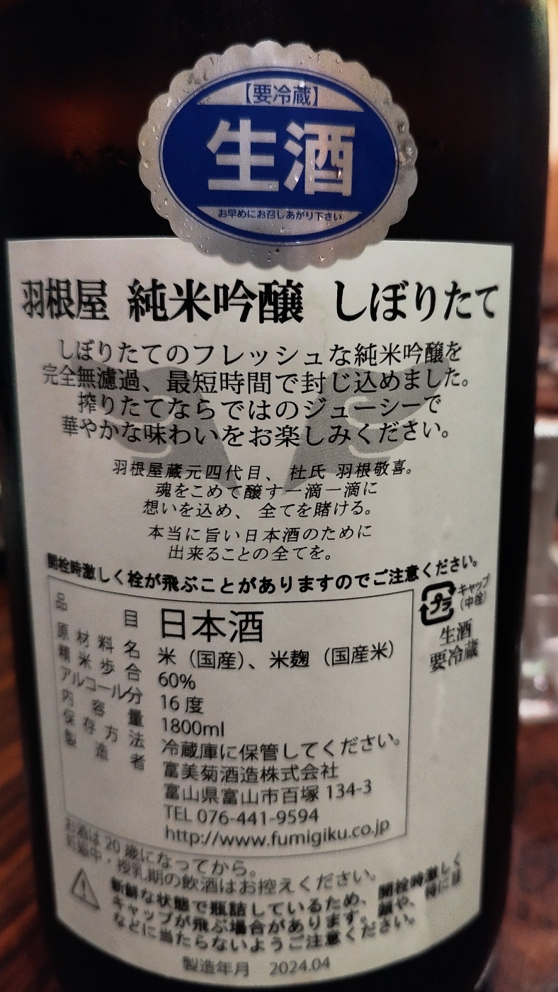 羽根屋 純米吟醸 しぼりたて |