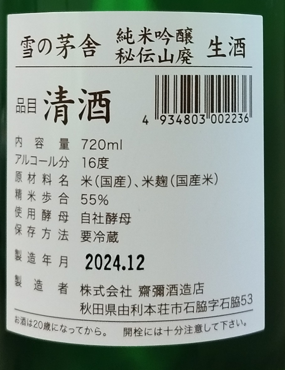 雪の茅舎 | 山廃純米生酒 | 秋田酒こまち | 65 | 蔵内酵母 | 16-17 | +1 | 1.8 | ‥ | ◎ |
