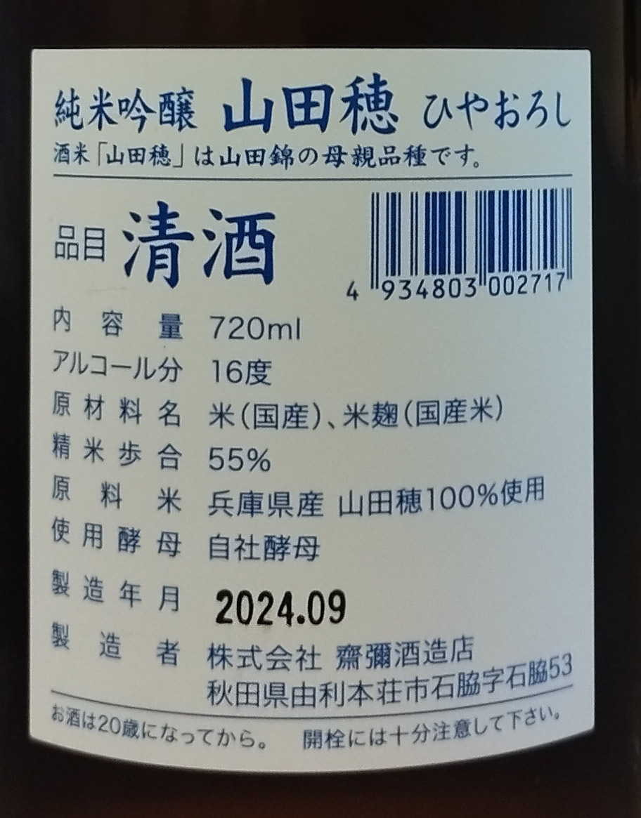 純米吟醸 | 山田錦/秋田酒こまち | 55 | 蔵内酵母 | 16 | +2 | 1.5 | ‥ | ○+ |
