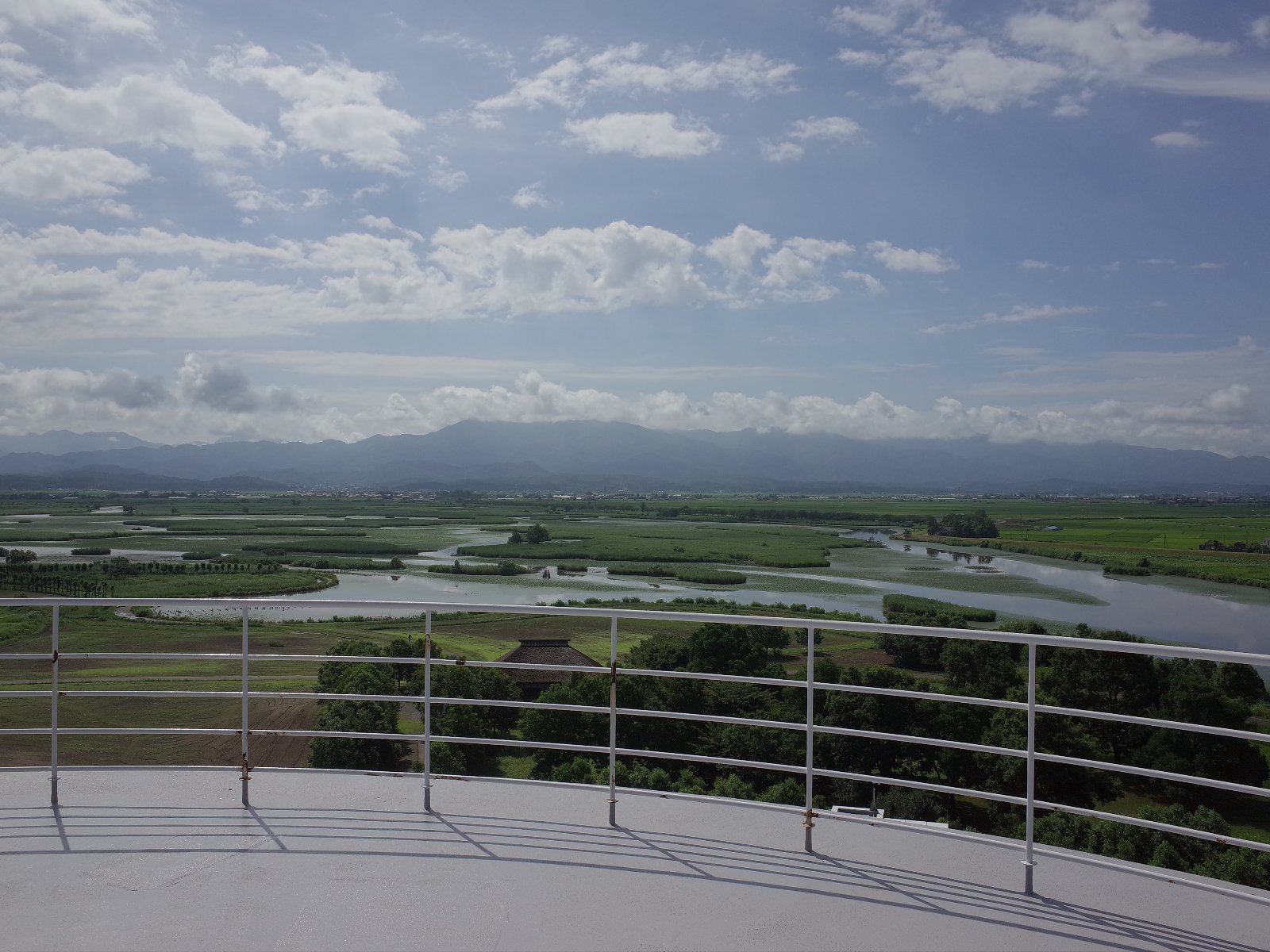 無料休憩所の向こうには広大な福島潟が広がっている。