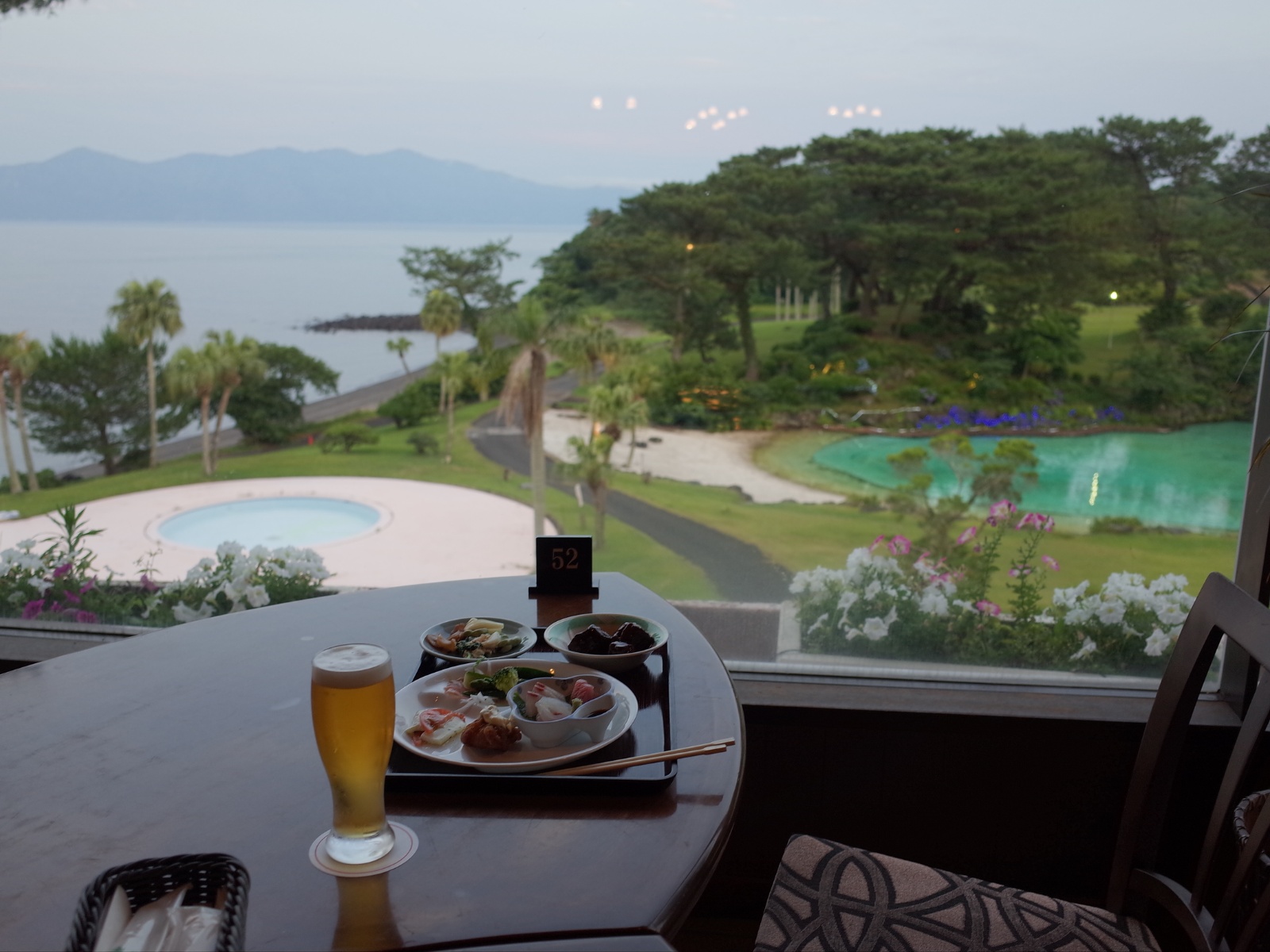 砂蒸し温泉で汗をたっぷりかいたので、とりあえず生ビール一択