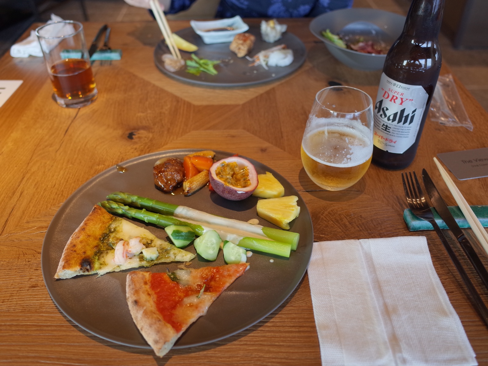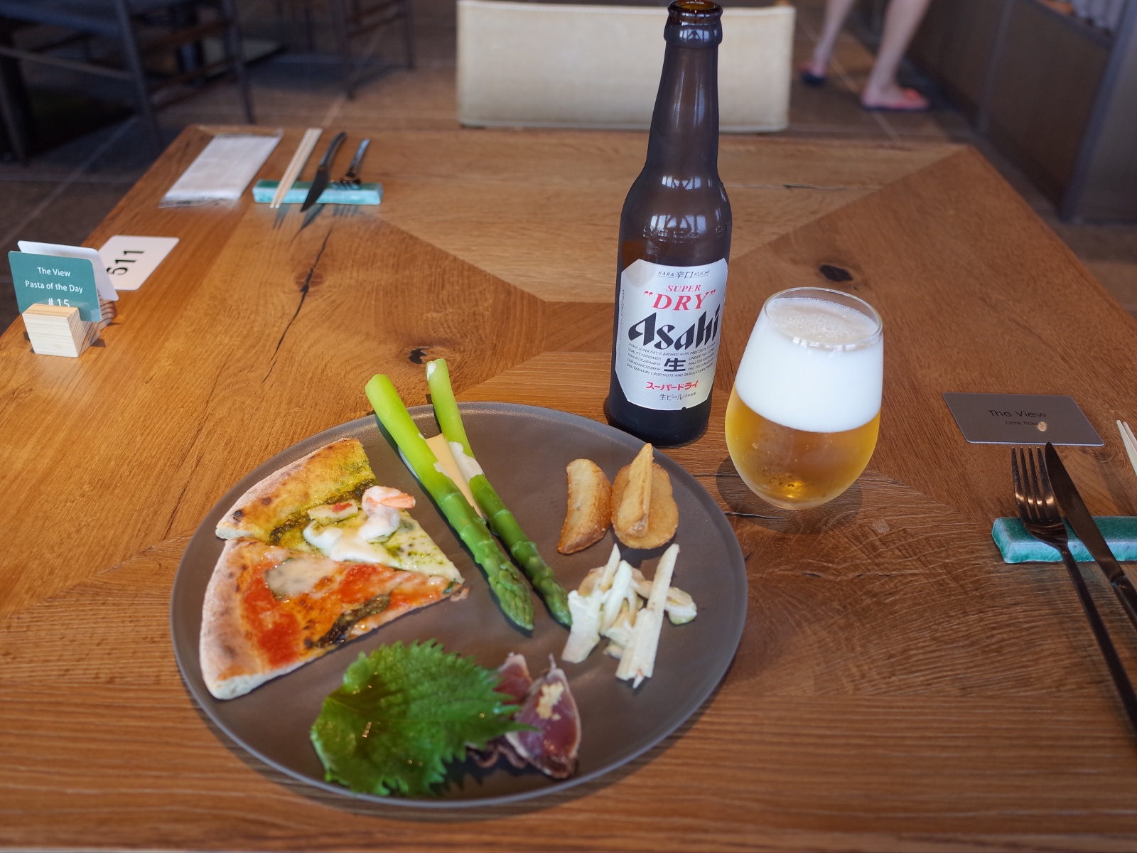 まずは瓶ビールで、ピザとアスパラが美味い。