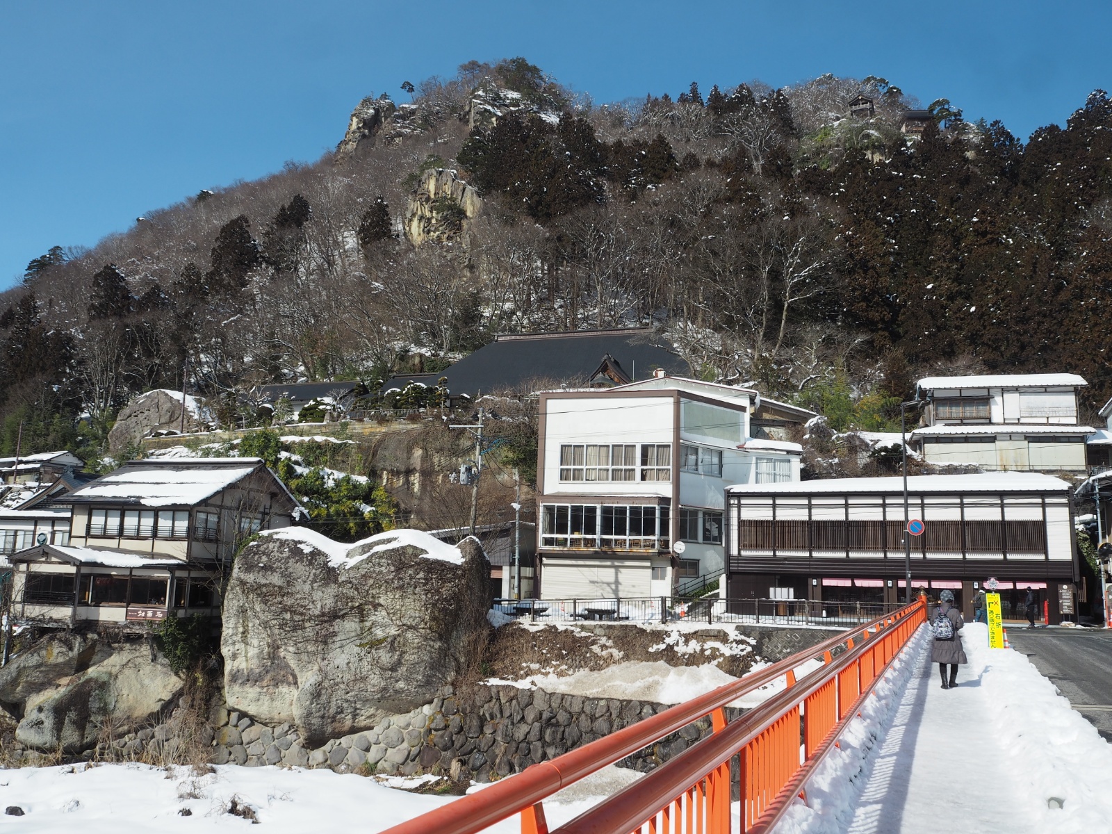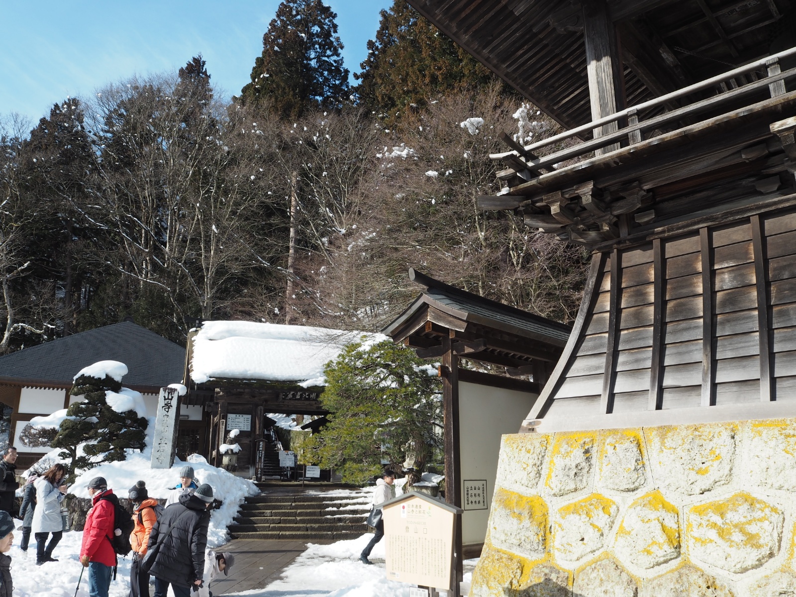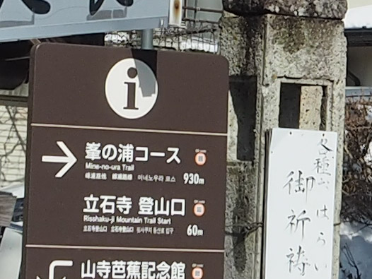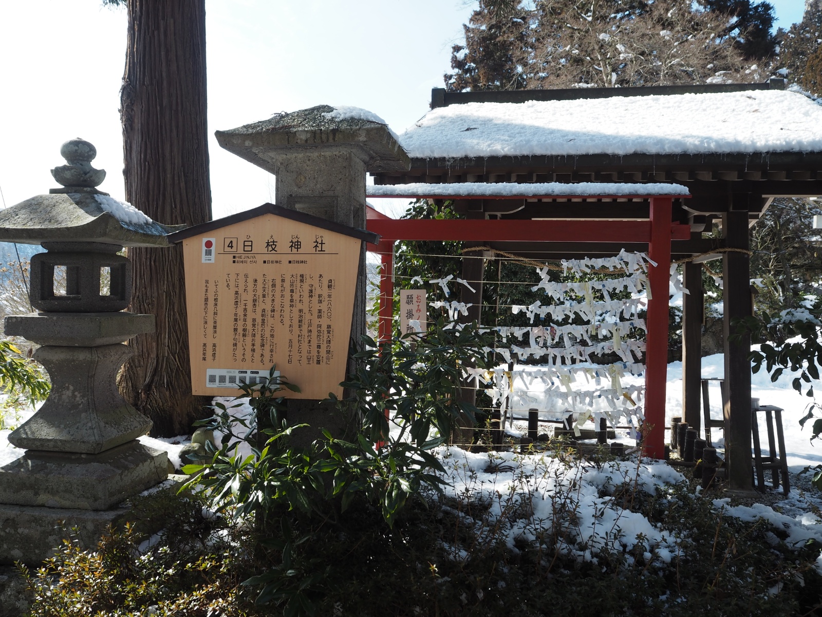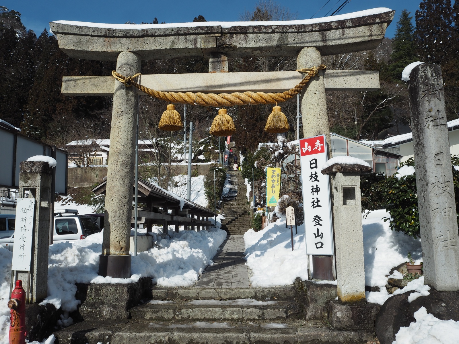 「山寺」「日枝神社登山口」と書かれた鳥居と、