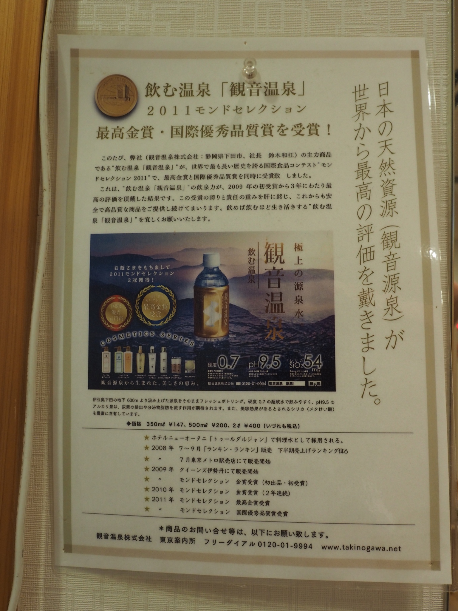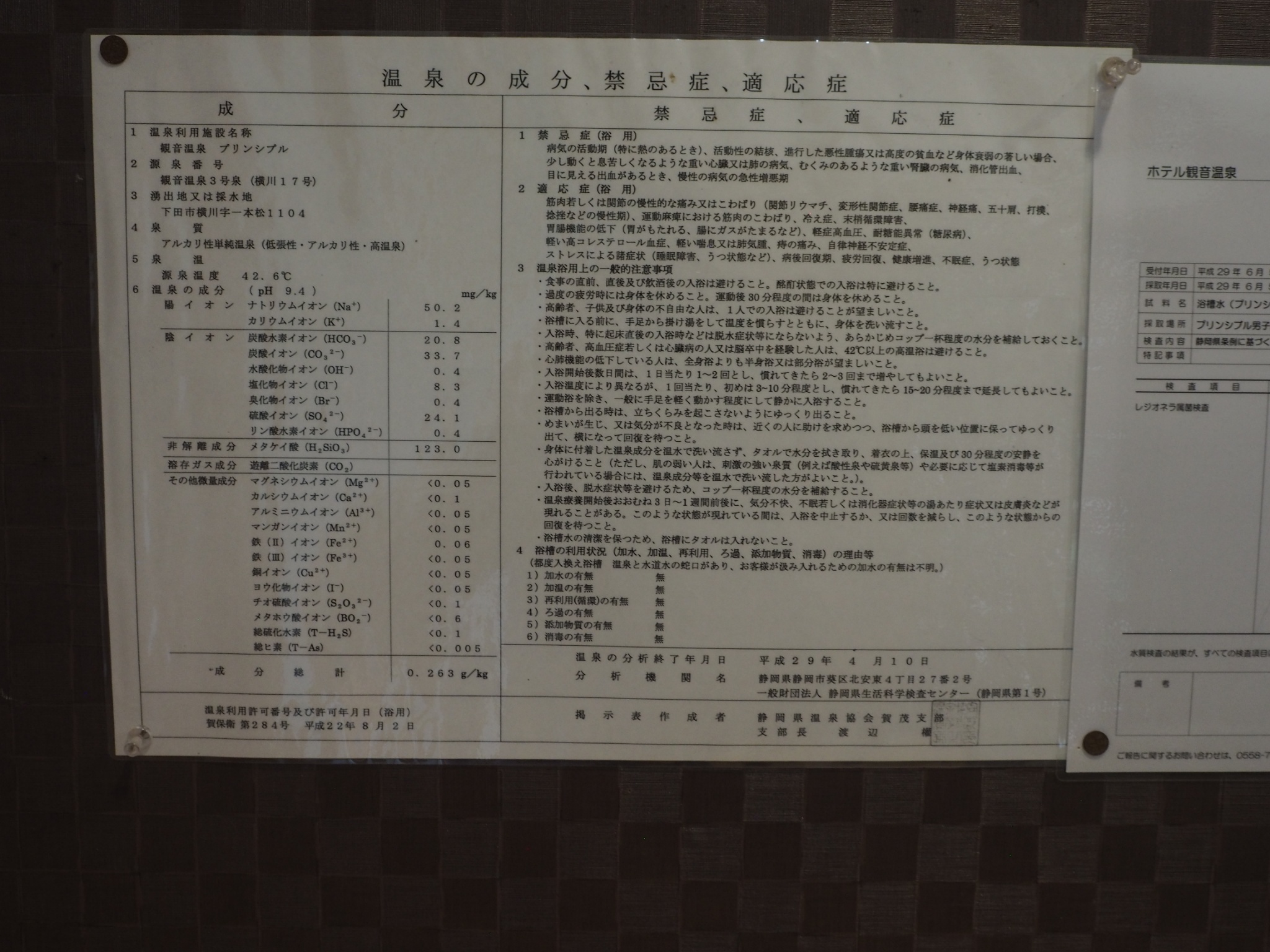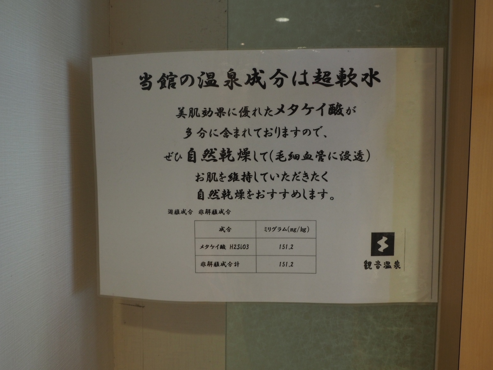 「観音温泉」は「(アルカリ性)単純温泉」でありながら素晴らしい泉質であり、「榊原温泉」と同様に温泉分析書