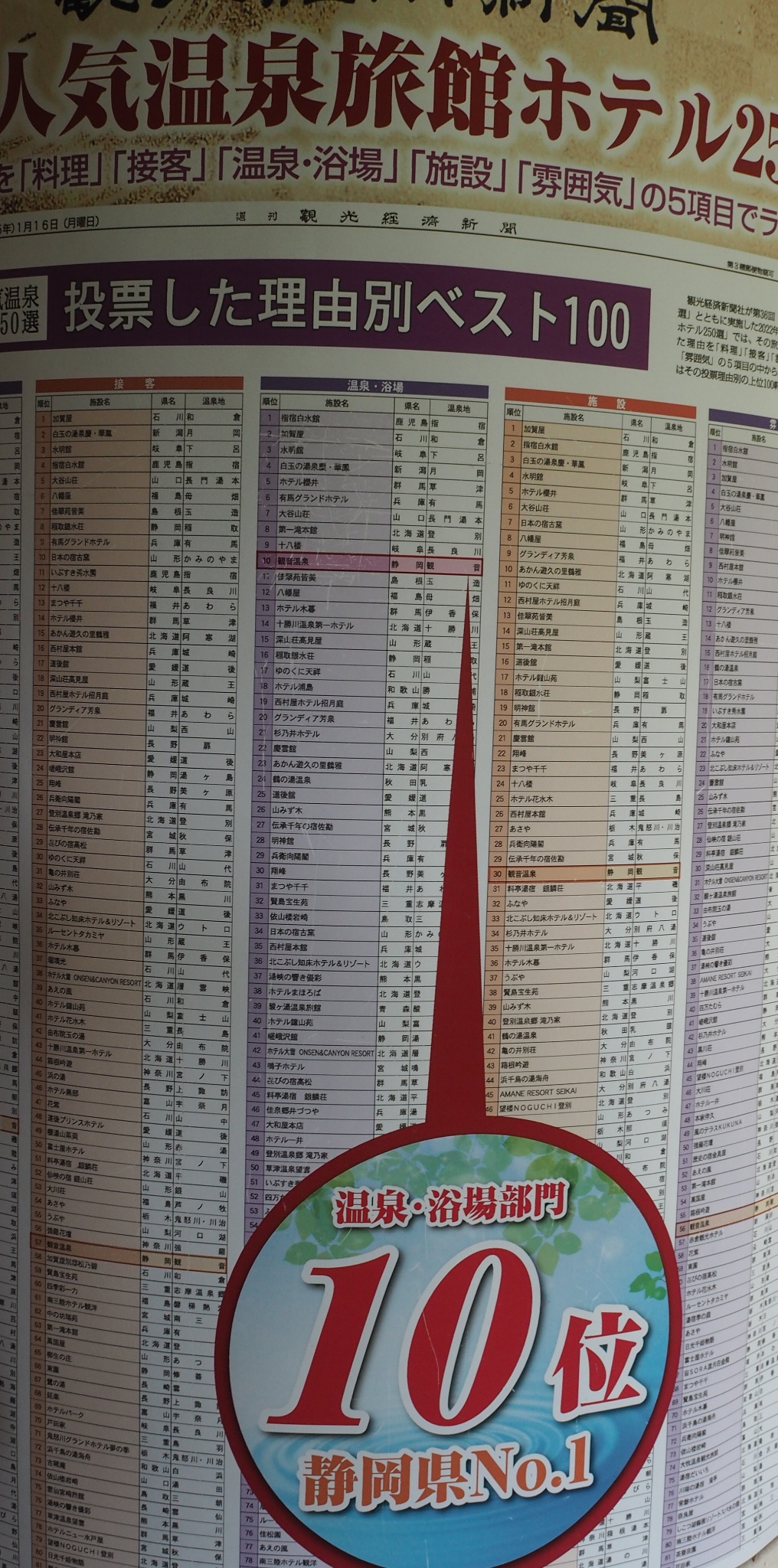 これは温泉旅館の人気ランキング、温泉浴場部門で全国 10位!