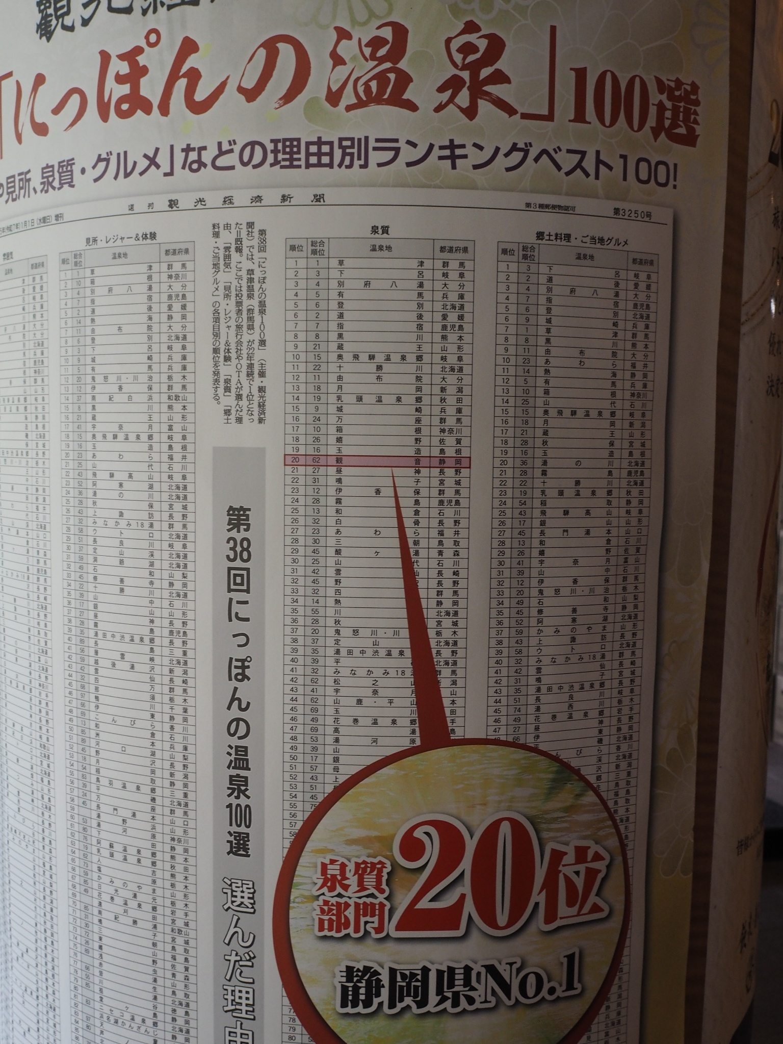 これは温泉地の人気ランキング、泉質部門で全国 20位!
