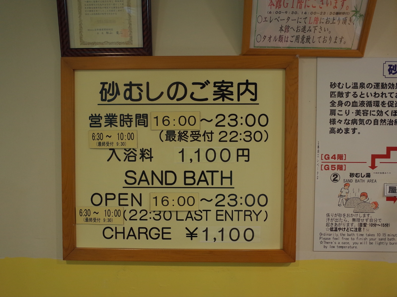 砂蒸し温泉の入浴料は1,100円、近くにある公営の砂蒸し会館は1,500円。